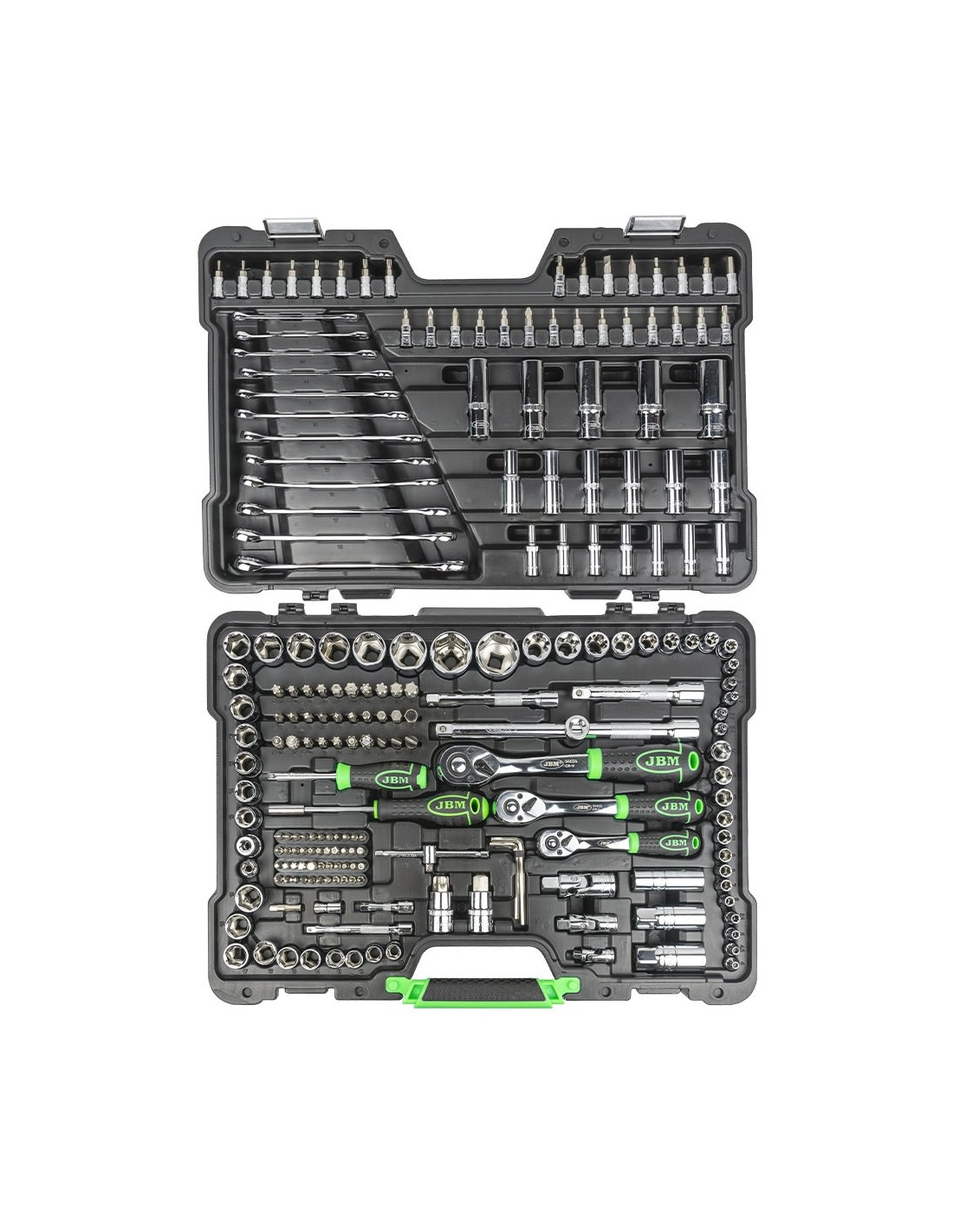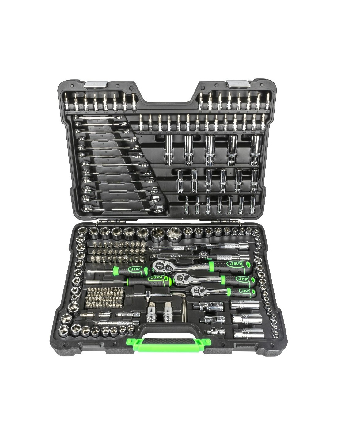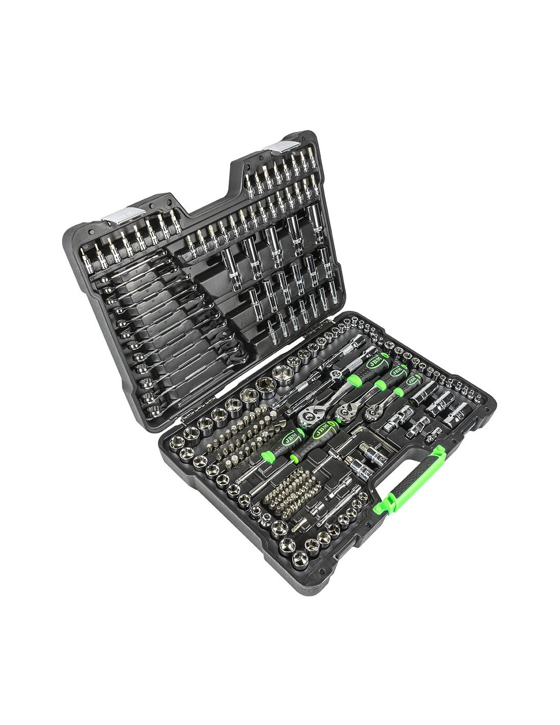 Incluye una amplia variedad de vasos hexagonales, Torx, puntas, llaves, carracas, adaptadores y accesorios, perfectamente organizados en un maletín robusto y fácil de transportar.