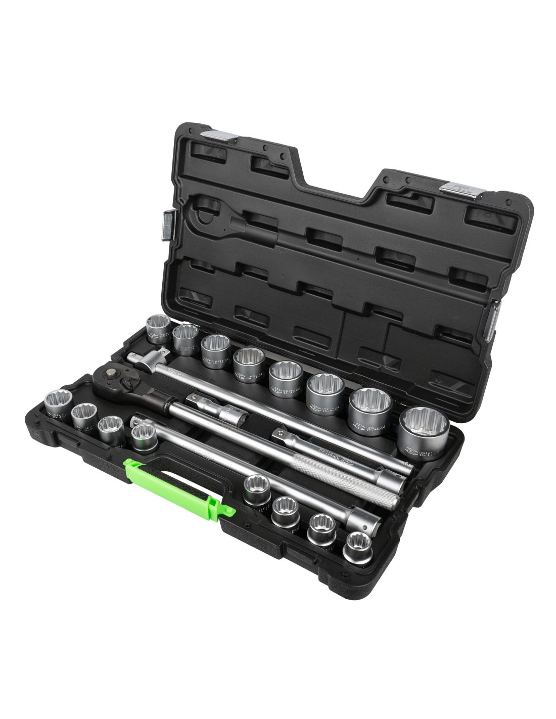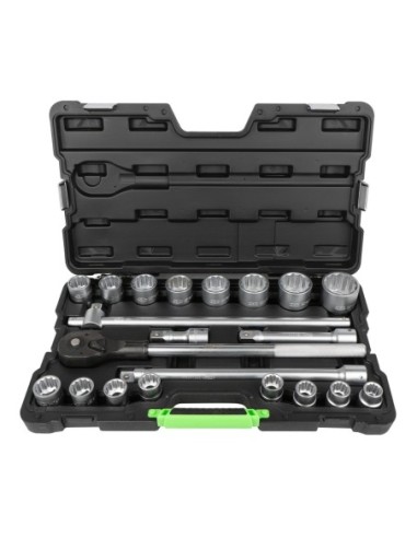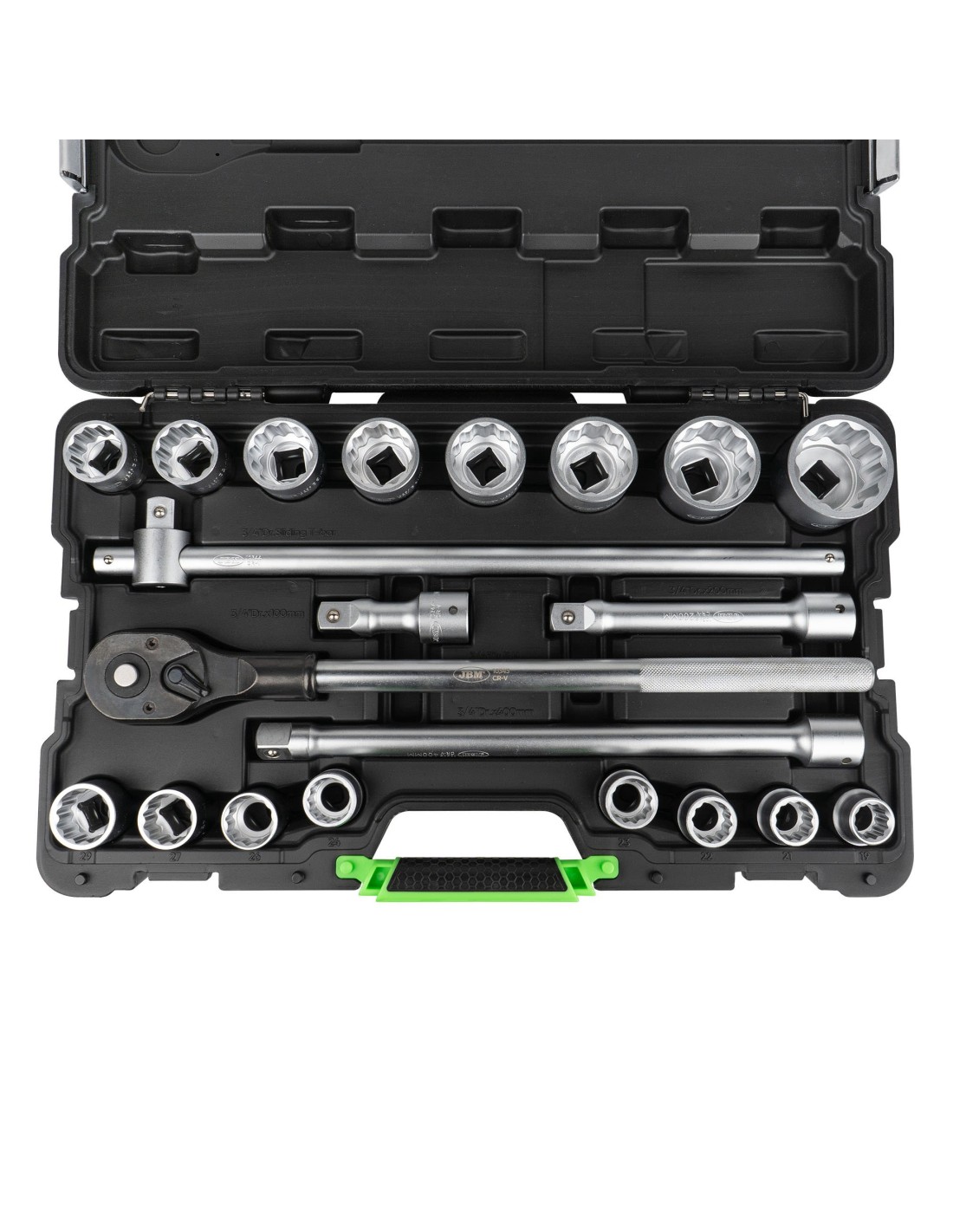 Maletín de herramientas de 21 piezas con vasos de 12 cantos de 3/4", acabado cincado y fabricados en acero CrV de alta resistencia. Incluye carraca universal de 500 mm, adaptador con corredera, barras de extensión y vasos cortos de 19 a 50 mm. Todo organizado en un robusto estuche, ideal para trabajos de alto par y aplicaciones profesionales en mecánica e industria.